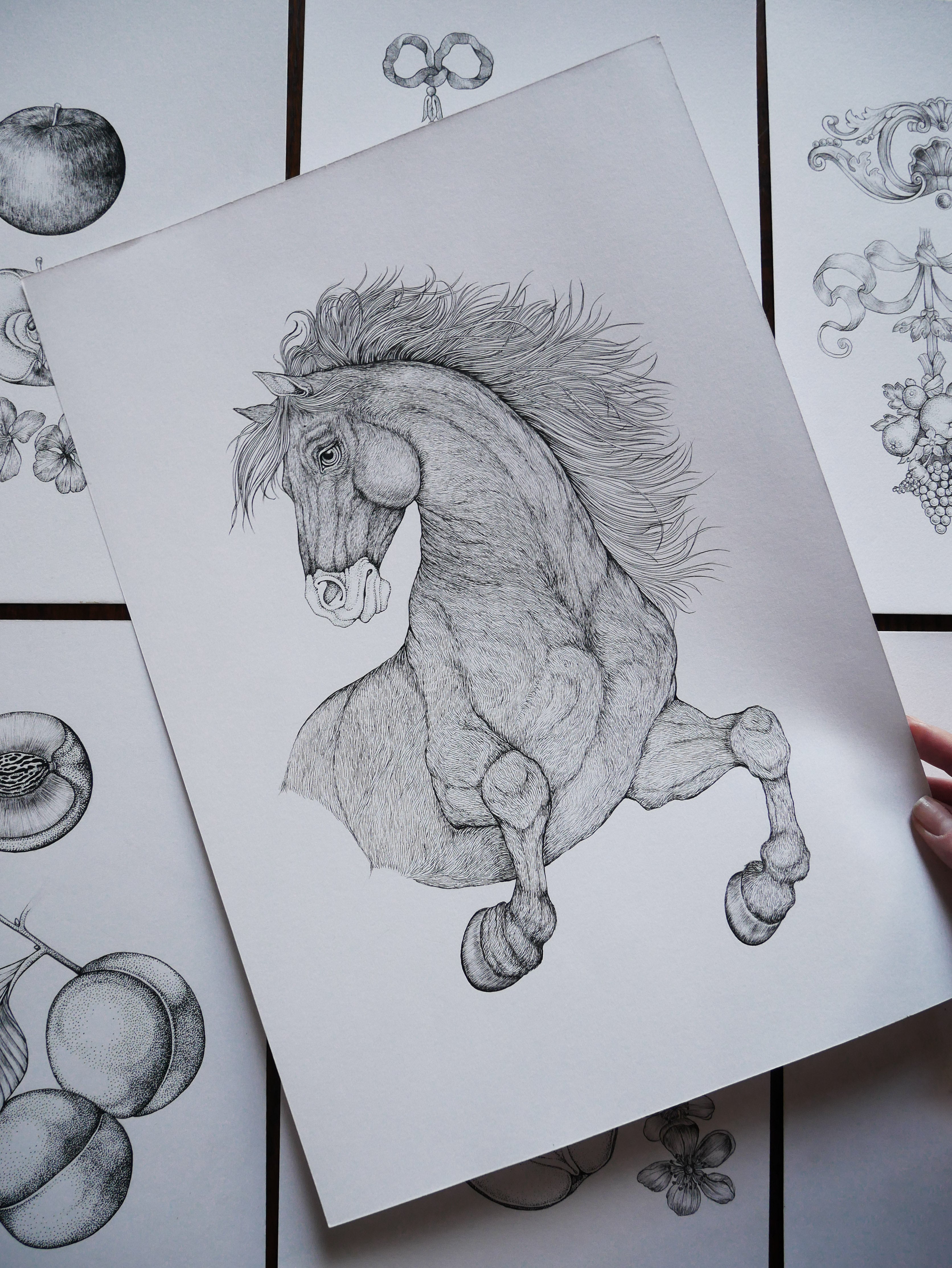 Each piece is meticulously hand-drawn with pen and paper before being digitally formatted in either colour or black and white.
