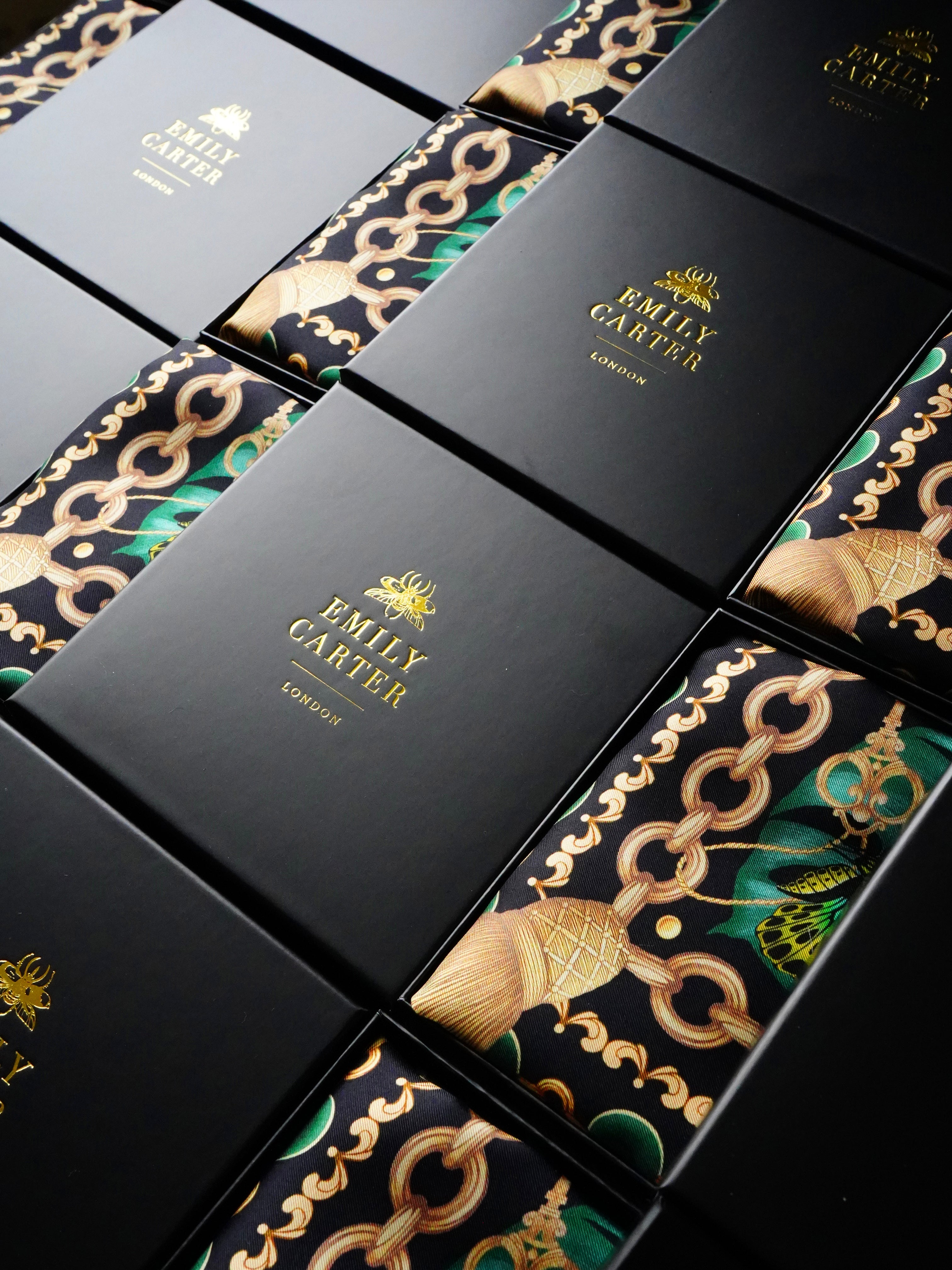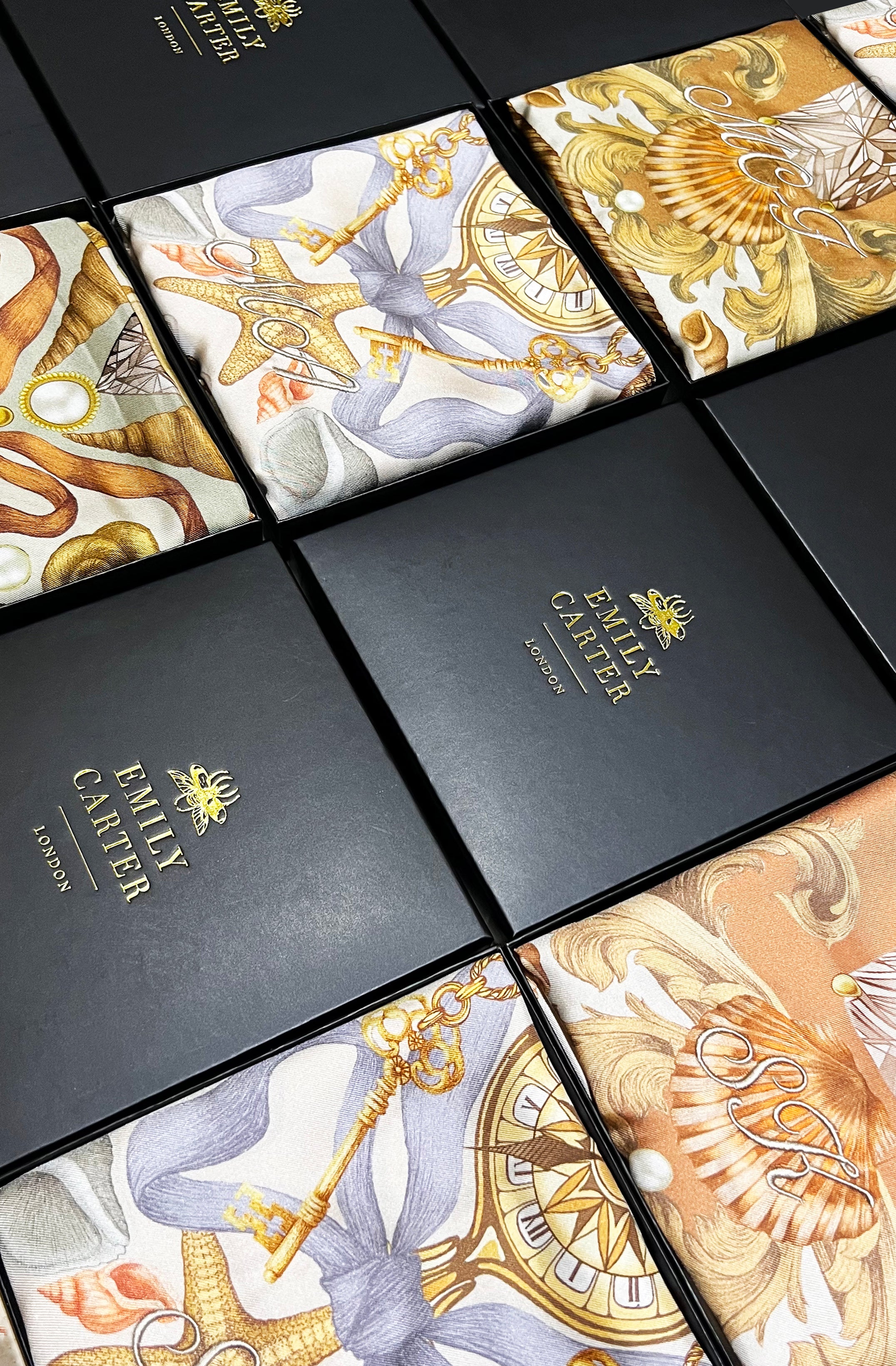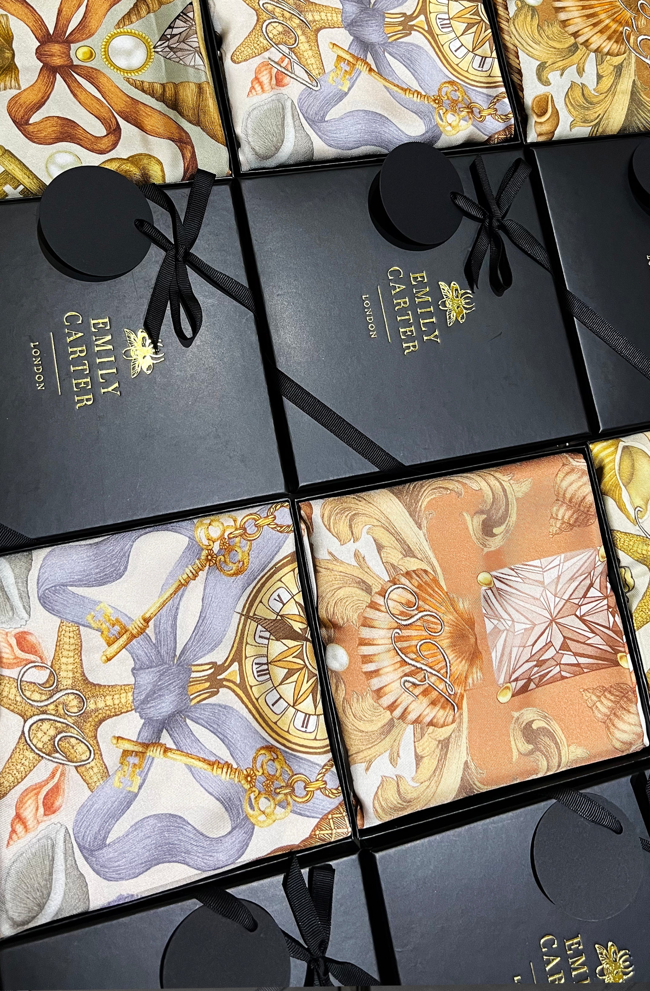 Emily works regularly on bespoke scarf designs for clients and corporates, and we now provide this as a service. Whether you are looking for a special gift for someone, a wedding present or gifting for a large event, we can personalise each item individually, and either work with one of our existing designs or create a design entirely bespoke which is unique to you.