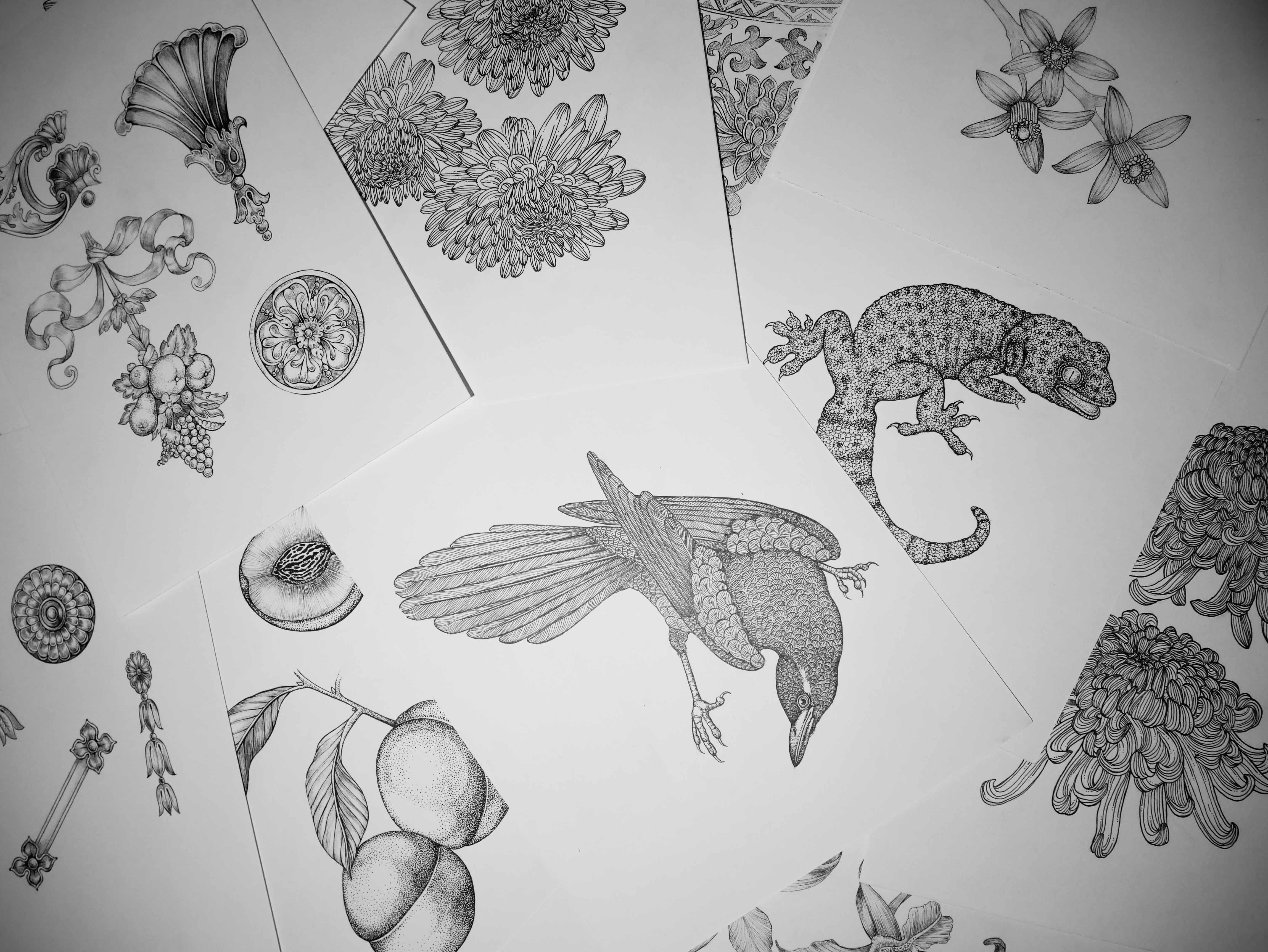Each piece is meticulously hand-drawn with pen and paper before being digitally formatted in either colour or black and white.